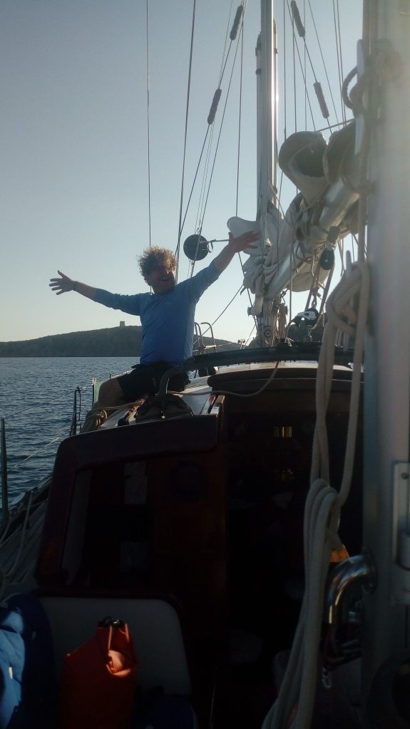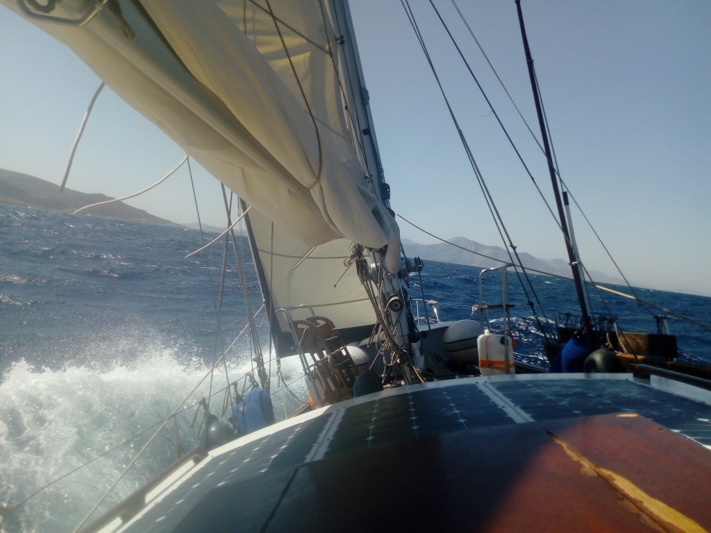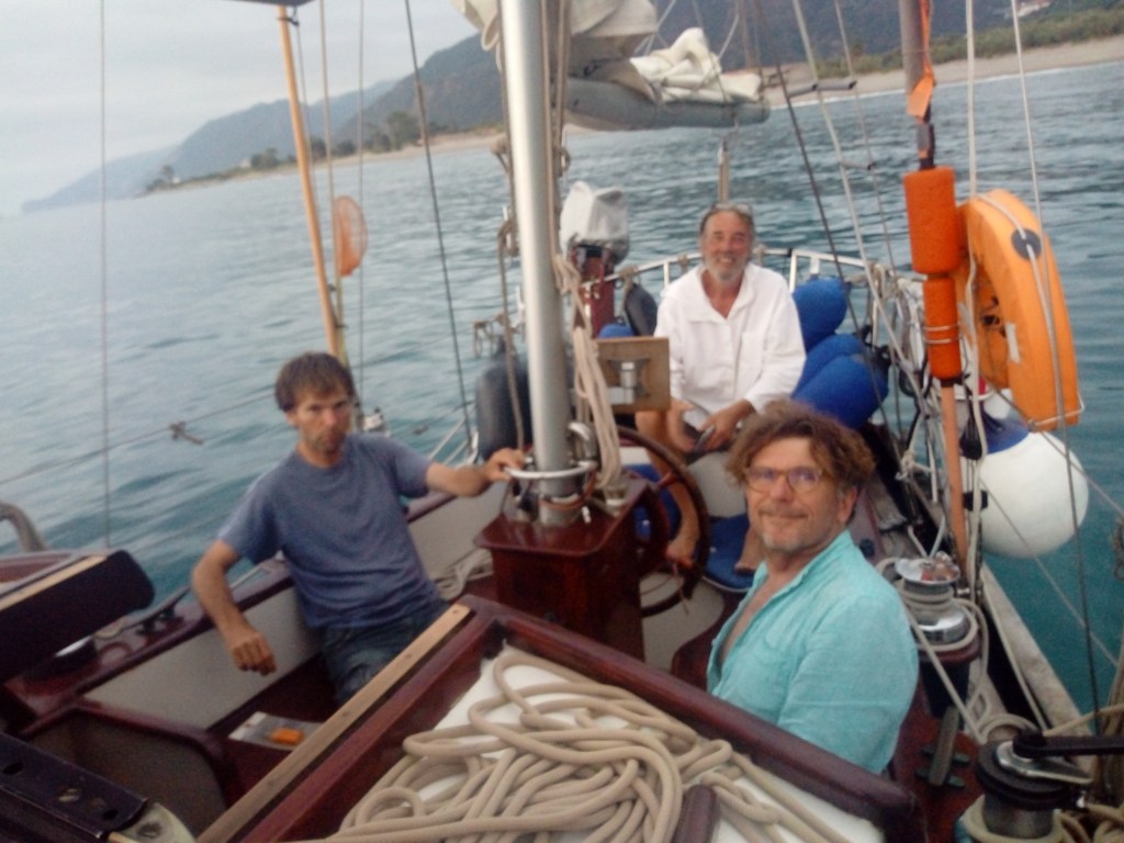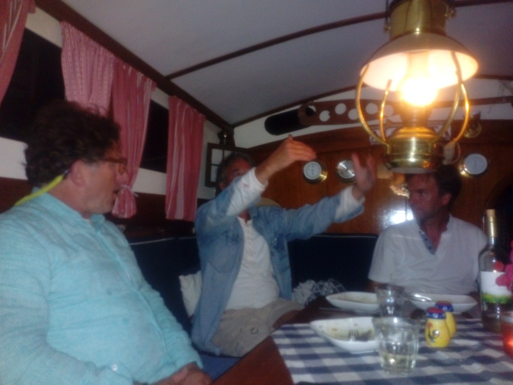 En dan Amsterdamse Gerard, levensondernemer en -genieter die zich naast de zeilerij wèl bekommert om aardse zaken als eten, drinken en slapen. De nuttige eigenschap die we alle vier gemeenschappelijk hebben – naast een diepe liefde voor zeilen en lachen – is dat we allemaal wel een drankje lusten en daar uitermate beroerd tegen kunnen. Dat schept een band. Met name tussen Gerard en Robby die ik stiekem, met wijnfles tussen de knieën geklemd, op het voordek aantref. Met dit sterrenteam gaan wij de elementen trotseren.