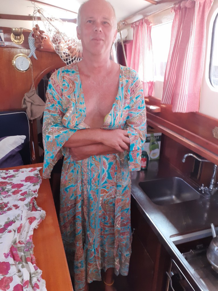 Op onze drijvende micro-kosmos swaffelen we af en toe op handen en voeten de vloer met een twijfelachtig duizenddingendoekje, soppen we onze andere onderbroek tijdens een stampwasje onder de douchezak, worden er uren gesproken over en besteed aan vissen met hengel en onderwaterharpoen waarna we afdruipen met de vegetarische bijbel onder de arm voor ‘creatief met komkommer’. Is mijn komkommer te slap of kan hij nog? is ook zo’n dagelijkse beslommering evenals het L.L.W.A. ( Low Level Wijn Alarm).