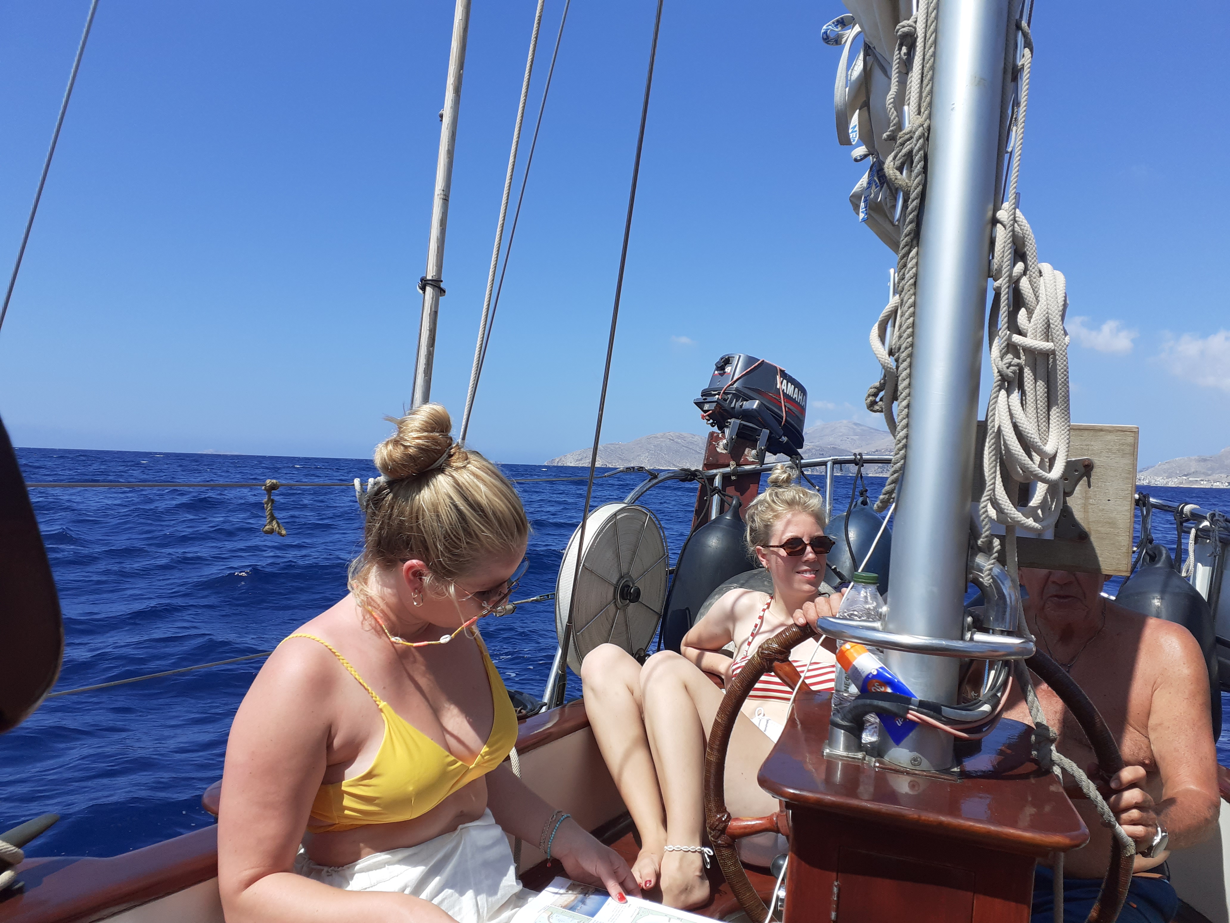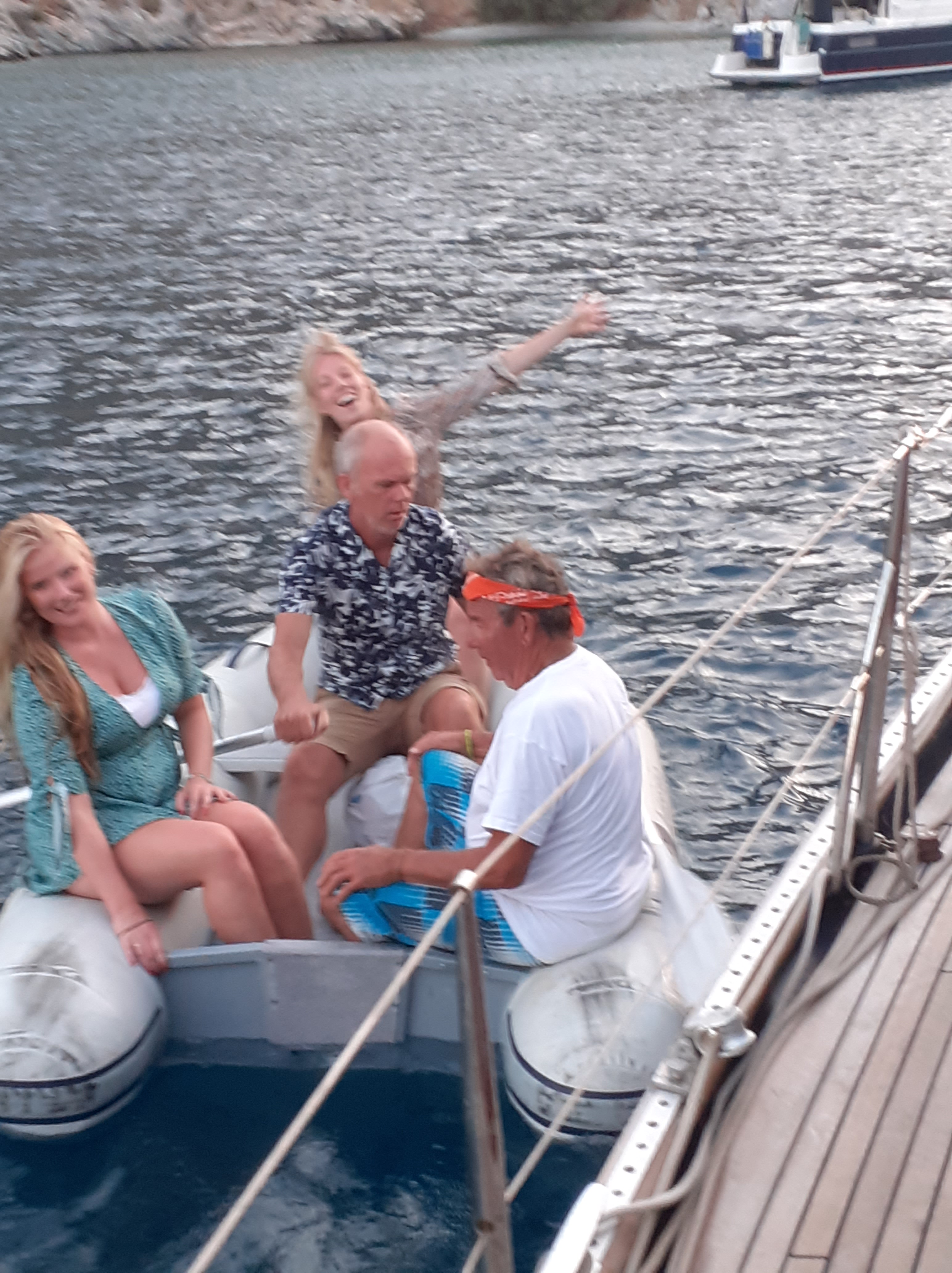 De volgende dag gaan we anker op. Als we het gereefde zeil omhoog trekken blijkt de kraanlijn niet doorgezet en waait in de windgenerator. Slowmotion. Boot trilt. Blad breekt af. Als een ninjaster tollend door de lucht. Een kreet… Inshallah! Zou naturisme onder de risikosporten vallen?